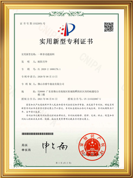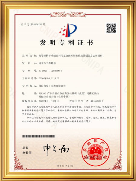 高导湿快干功能面料用复合纳米纤维膜及其制备方法和面料证书